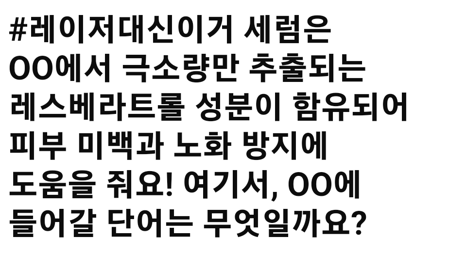 퀴즈정답 레이저대신이거 세럼은 OO에서 극소량만 추출되는 레스베라트롤 성분이 함유되어 피부 미백과 노화 방지에 도움을 줘요! 여기서, OO에 들어갈 단 by sitego 2022. 10. 4. 레이저대신이거 세럼은 OO에서 극소량만 추출되는 레스베라트롤 성분이 함유되어 피부 미백과 노화 방지에 도움을 줘요! 여기서, OO에 들어갈 단어는 무엇일까요? 레이저대신이거 세럼 퀴즈 세럼-퀴즈 정답: 포도 반응형 공유하기 게시글 관리 사이트 바로가기 저작자표시 비영리 변경금지 (새창열림) '퀴즈정답' 카테고리의 다른 글 위메프에서는 위메프데이 말고도 이벤트가 계속 됩니다! 10월 16일에는 OO특가데이가 진행되는데요~! 과연 OO에 들어갈 말은 무엇일까요? (0) 2022.10.05 영양은 물론 맛도 신경 쓴 닥터바리스타 버터커피 : 바리스타 자격증을 가진 의사가 9개월간 공부했습니다. 전 세계 각국의 방탄커피들과 시중의 방 (0) 2022.10.04 빙산의 일각에 불과한 겉에 보이는 기미. 사실 피부 속에는 수많은 잡티, 기미가 숨어있는데요, 이는 바로 OOO이 피부 표면으로 올라오기 때문이 (0) 2022.10.04 위메프에서는 위메프데이 말고도 이벤트가 계속 됩니다! 10월 9일에는 OO특가데이가 진행되는데요~! 과연 OO에 들어갈 말은 무엇일까요? (0) 2022.10.04 프리미엄 숙소예약데리호텔은 프리미엄호캉스를 즐길 수 있는 호텔&다이닝 라인업과함께 'ㅇㅇㅇㅇ'를 진행해요!(초성 힌트: ㄹㅍㅇㅋ) (0) 2022.10.04 관련글 영양은 물론 맛도 신경 쓴 닥터바리스타 버터커피 : 바리스타 자격증을 가진 의사가 9개월간 공부했습니다. 전 세계 각국의 방탄커피들과 시중의 방 빙산의 일각에 불과한 겉에 보이는 기미. 사실 피부 속에는 수많은 잡티, 기미가 숨어있는데요, 이는 바로 OOO이 피부 표면으로 올라오기 때문이 위메프에서는 위메프데이 말고도 이벤트가 계속 됩니다! 10월 9일에는 OO특가데이가 진행되는데요~! 과연 OO에 들어갈 말은 무엇일까요? 프리미엄 숙소예약데리호텔은 프리미엄호캉스를 즐길 수 있는 호텔&다이닝 라인업과함께 'ㅇㅇㅇㅇ'를 진행해요!(초성 힌트: ㄹㅍㅇㅋ) 댓글