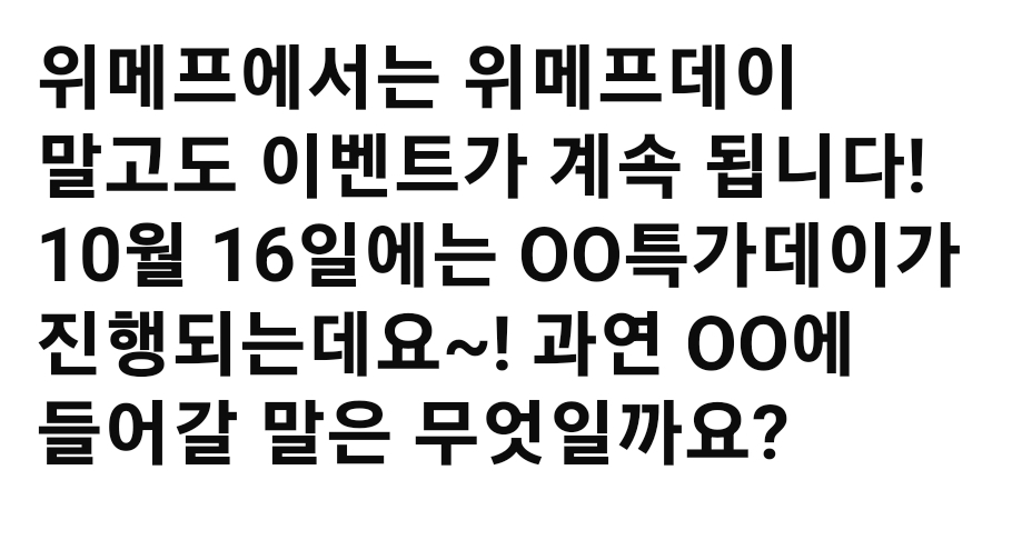위메프에서는 위메프데이 말고도 이벤트가 계속 됩니다! 10월 16일에는 OO특가데이가 진행되는데요~! 과연 OO에 들어갈 말은 무엇일까요?